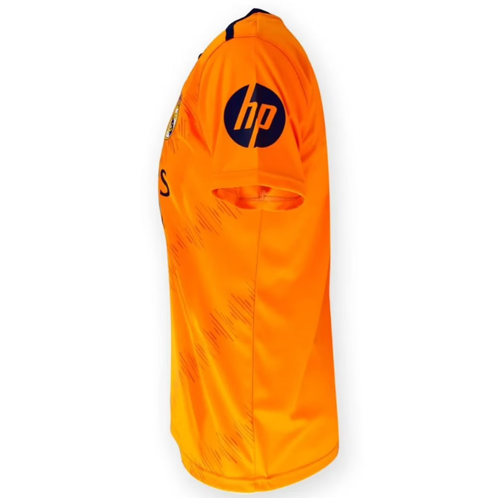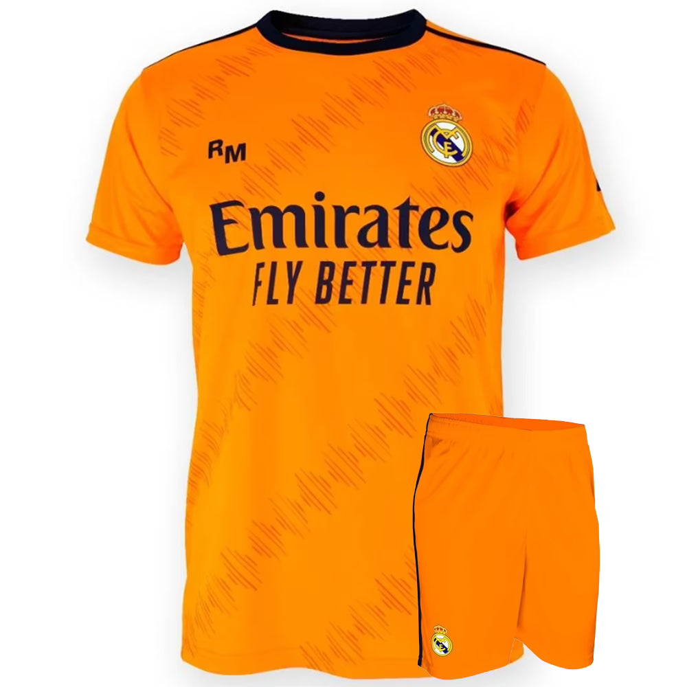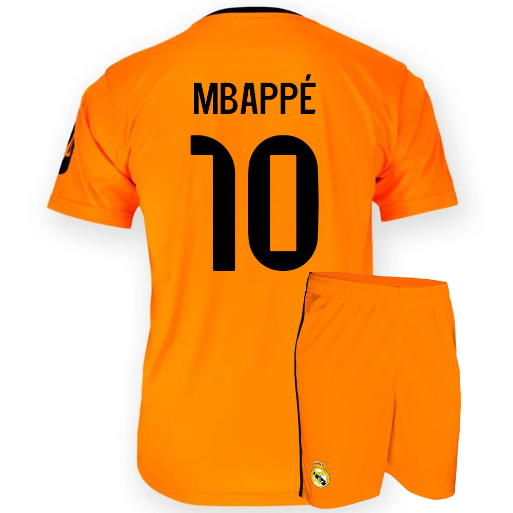 Laat je skills zien in stijl met dit Real Madrid uittenue van Mbappé! Het feloranje ontwerp springt direct in het oog, terwijl het ademende en rekbare polyester zorgt voor ultiem comfort tijdens iedere training of wedstrijd. Het tenue bestaat uit een shirt en short, beide voorzien van het iconische Real Madrid-logo en het rugnummer 10 van Kylian Mbappé.