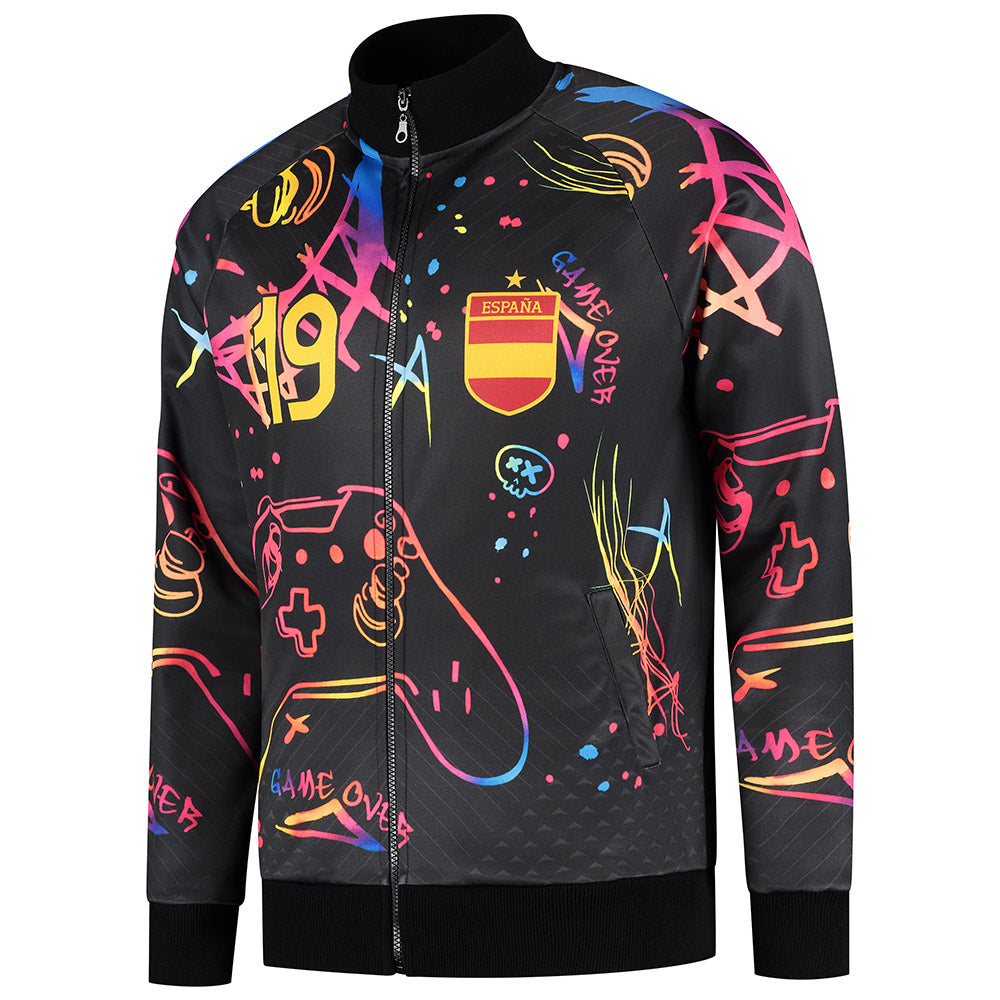 Jackan har en tuff design full av spelkontroller, neonfärger och lekfulla detaljer som "Game Over". De matchande svarta byxorna fulländar dräkten. Perfekt för att träna, chilla eller gå till skolan i.